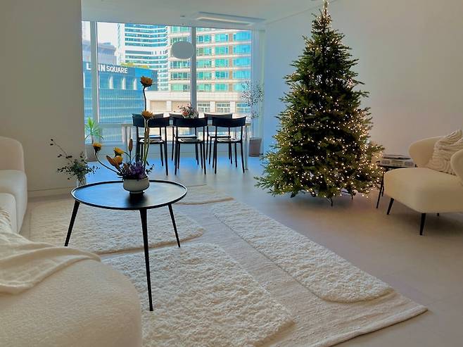 크리스마스 트리가 오면서 1인 체어랑 소파 테이블을 트리 옆으로 배치해두었어요. 다양한 곳에 활용성 있는 가구를 사 놓으면 공간이 질릴 때마다 바꾸어 줄 수 있어서 질릴 틈이 없이 좋아요.