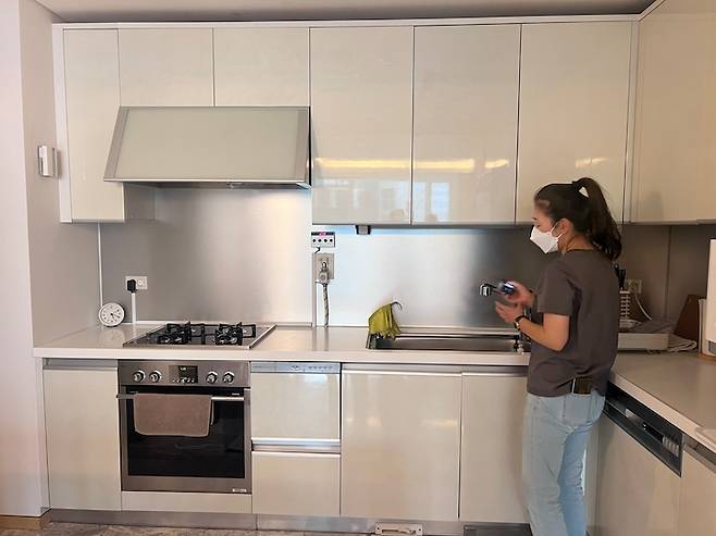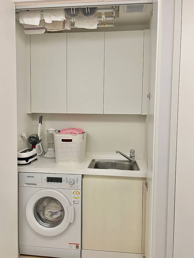 그리고 이 집에 와서 제가 드디어 손 세탁을 하게 되었는데요. 요즘 아파트에 많이 하는 세탁기 옆에 손빨래 할 수 있는 공간이 20년 전에 생겼다는 게 놀랐어요. 이게 있으니까 정말 편하게 빨래를 할 수 있어서 너무 좋더라구요. 그렇게 크지 않은 공간인데 알차게 건조기까지 내려오고, 앞에 아일랜드장을 넣어서 각종 청소 용품들은 다 저기에 있어요.