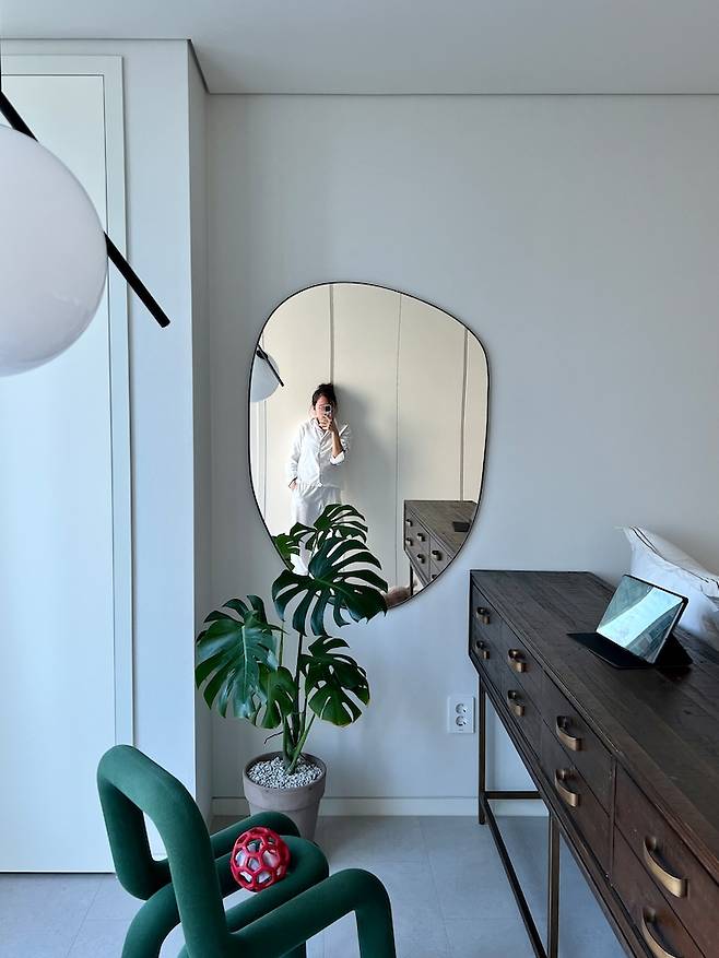 침대 뒤쪽에는 빈티지한 가구와 함께 대형 거울과 식물이 어우러져 제가 7년간 그렇게 갖고 싶었던 화장하고 싶은 감성 공간을 만들었어요. 제가 포인트 컬러 가구로 셀렉하는 게 거의 의자인데, 식물 컬러와도 잘 어우러질 수 있는 그린 컬러더라구요.