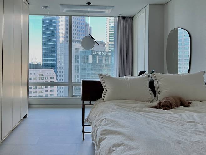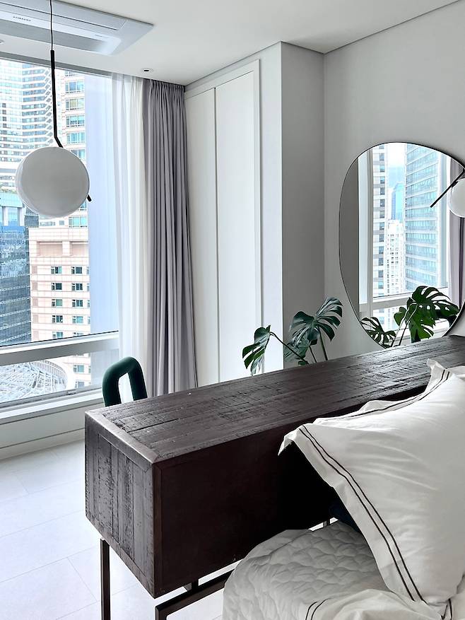 안방 문을 열고 들어오면 보이는 모습으로 여기도 동일하게 커튼 없는 시원한 모습이 좋아서 왼쪽 히든 장 뒤로 커튼을 다 몰 수 있도록 커튼을 달았어요. 중앙에 플로스 글로벌 투명한 조명이 영롱하니 참 예쁜데 실제 생활할 때는 부딪치는 경우가 종종 있어요. 길이는 조절 가능하나 제 감성을 위해서 남편이 가끔 타종 행사를 하나 양보해주지 못하고 있는 부분이에요.