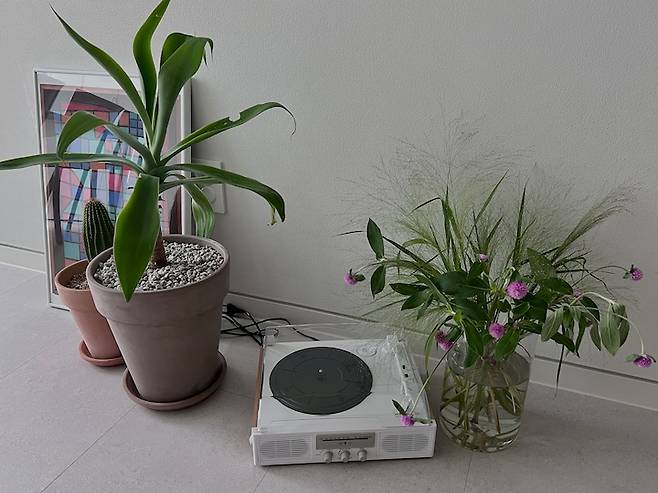 특히 턴 테이블에 대한 고민이 많았는데 스피커 일체형으로 공간도 덜 차지하고 블루투스, 라디오도 다 되고, 제가 원하는 LP의 시각 감성적인 부분까지도 완벽한데 이 가격이라니 정말 유레카! 였어요. 실제로는 LP에 대한 의지가 높아 많이 들을 거라 생각했지만 아무래도 평상시에는 핸드폰 블루투스로 노래를 훨씬 많이 듣게 돼요.