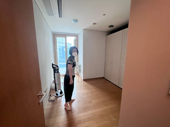 이전에 세입자 분께서는 안방이 가장 넓은데 아일랜드 장이 워낙 길게 되어 실제 사용 공간이 길쭉한 형태로 애매해서 옷과 세탁기 화장대 등 드레스룸으로 쓰고 있었어요.