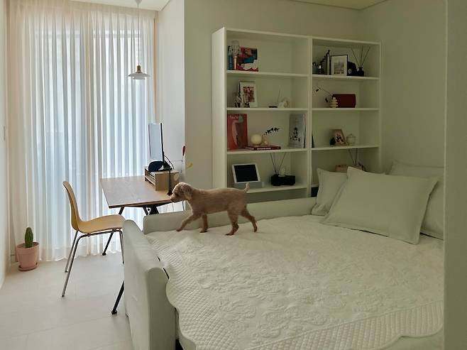 그래서 데스크탑을 놓을 수 있는 책상, 침대 그리고 예쁜 홈 데코를 좋아하는 저에게 꼭 필요한 장식장이 필요했어요. 우선 침대를 고르다 보니 업무 공간과는 느낌이 너무 멀어지고 그냥 방 같은 느낌이 들어 소파 베드를 생각했어요.