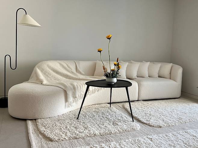 제가 원하는 크림 컬러에 입체적으로 질감이 들어간 마음에 쏙 든 카페트와 모던하지만 유선형이라 소파와 잘 어울릴 것 같은 철제 소파 테이블로 스타일링했어요.