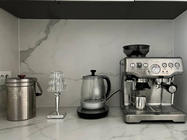 이 공간은 냉장고 장이 확장되면서 기존에 냉장고 장 옆에 길게 있던 아일랜드 상판 부분이 짧아져 죽은 공간이 생겼어요. 기존에는 스텐 제품의 홈 카페를 만들었다가 정수기를 보조 주방에 두면서 주전자가 멀어서 불편하더라구요. 음식물 쓰레기통과 함께 보조 주방으로 옮겨 두었어요.