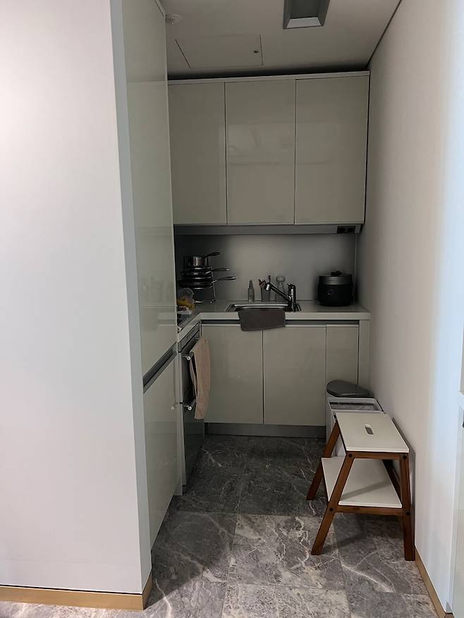 메인 주방 옆으로 보조 주방이 이어지는데 부엌 안에 들어와야지만 볼 수 있는 잘 보이지 않는 구조라 정말 좋아요. 밥솥과 같이 보이기 싫은데 매일 해야 하는 것들을 여기에 두었어요.