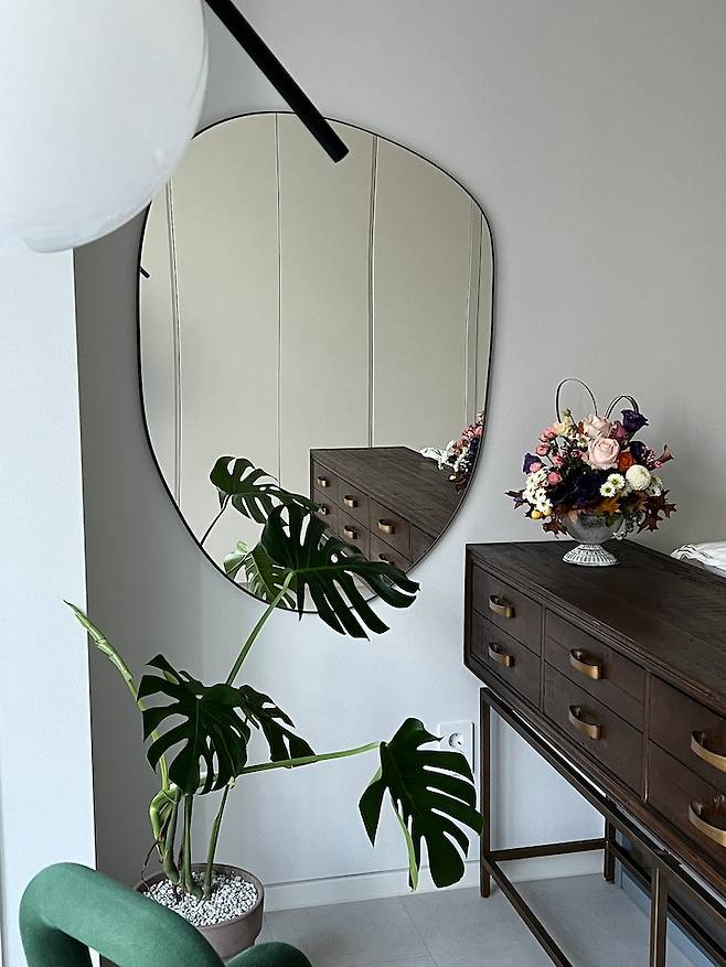벽에 거울, 천정 조명에 식물이 어우러져 이 공간은 제가 외출하기 전에 꼭 보고, 심심할 때마다 보는 그런 공간이 되었어요.