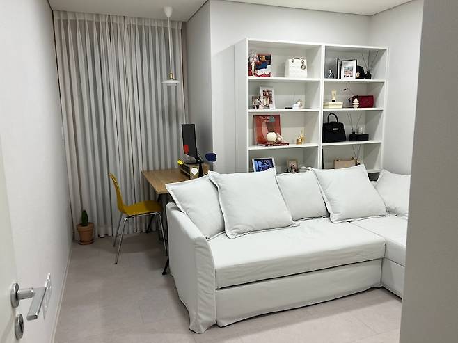언니와 딸이 같이 자야 해서 큰 사이즈 소파 베드를 넣었더니 이 방이 그렇게 작은 방이 아니지만 이 모든 게 들어가는 구조를 찾기가 정말 힘들었어요. 게스트룸 소파 베드는 실제 접었다 폈다가 아주 쉽고 천 갈이가 가능한 이케아 제품이에요.