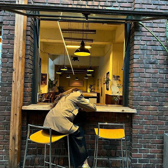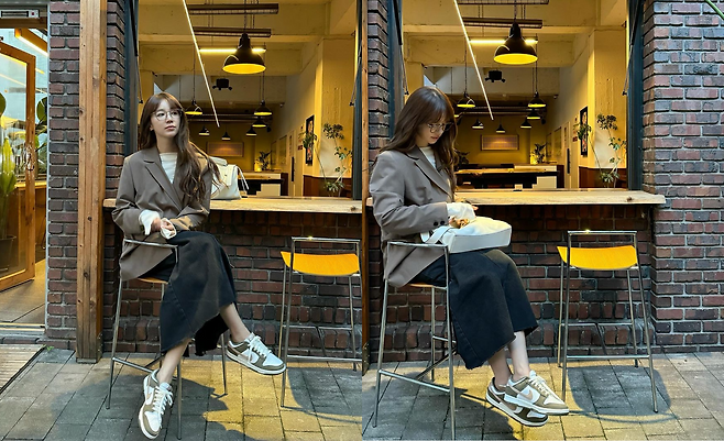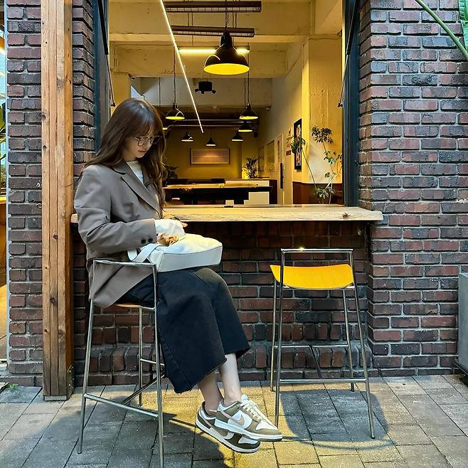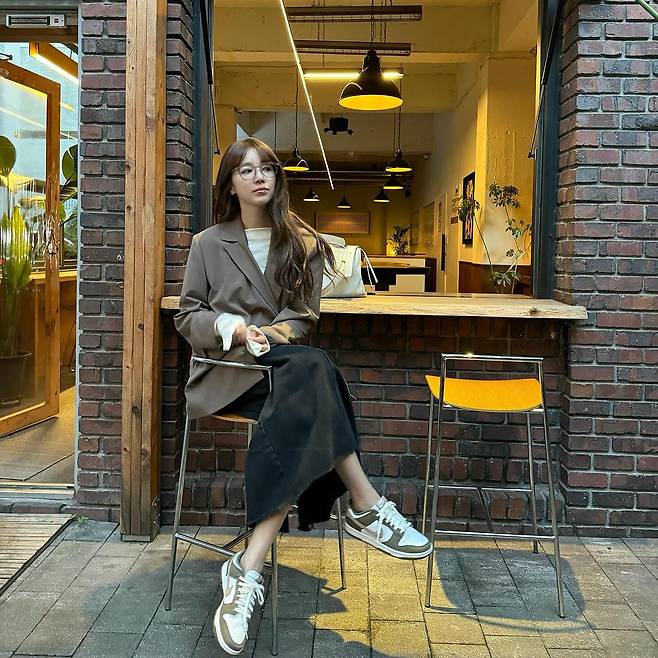 긴 생머리와 안경을 써서 내추럴한 모습으로 외출에 나서 가을 분위기를 자아해냈다.