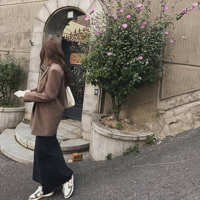 공개 된 사진 속 윤은혜는 화이트 셔츠를 이너로 입고 브라운 자켓과 블랙 롱치마를 입어 꾸안꾸 데일리룩을 선보였다. 스니커즈와 핸드백로 스타일링하여 캐주얼한 코디를 자랑했다.