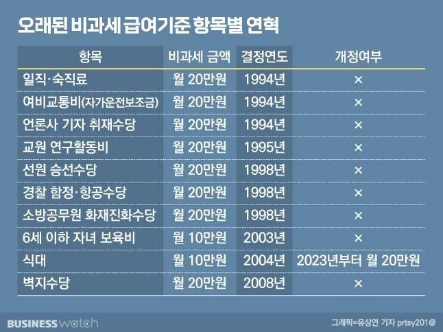 하지만 식대 외에도 10년 혹은 20년 이상 물가변동 반영 없이 고정된 비과세 급여항목들도 많은 것으로 확인됐다.