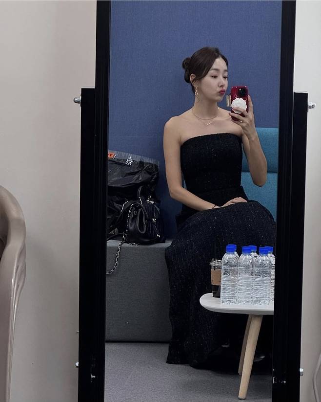 튜브톱 블랙 드레스는 쇄골과 어깨 라인을 드러내며 우아하고 시크한 분위기를 자아냈습니다.
