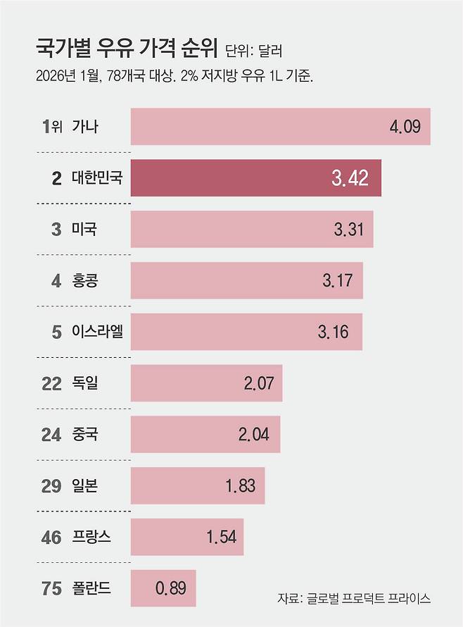 흰 우유 수요 감소의 다른 원인으로는 세계 최고 수준의 가격도 꼽힌다. 국제 물가 비교 사이트 ‘글로벌 프로덕트 프라이스’에 따르면 1월 기준 한국의 우유 가격(1.5∼2.5% 저지방·1L)은 3.42달러(약 5150원)로 집계됐다. 조사 대상 78개국 가운데 가나에 이어 두 번째로 높았다. 중국(2.04달러), 일본(1.83달러)과 비교하면 한국 우유 가격은 1.7∼1.9배가량 비싼 수준이다. 멸균 우유의 주요 산지인 유럽권과의 격차는 더 크다. ‘믈레코비타’ 등 멸균 우유 브랜드로 익숙한 폴란드(0.89달러)와 비교하면 국내 우유는 3.8배 더 비싼 것으로 나타났다.