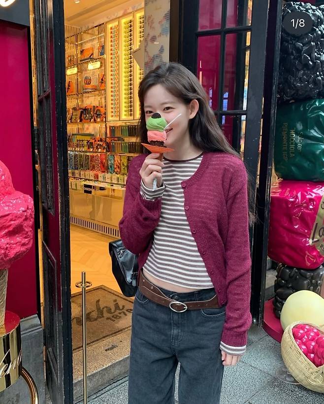 머플러의 붉은 색감이 최윤지의 맑은 피부 톤과 어우러져 전체적으로 생기 있는 분위기를 자아냅니다.