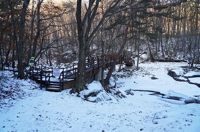 난이도: 아주 쉬움: 탐방지원센터를 출발하면 300m 지점에 첫 쉼터가 나타나고, 이어지는 데크길을 따라 걷다 보면 계곡 소리에 맞춰 리듬처럼 발걸음이 가벼워집니다.