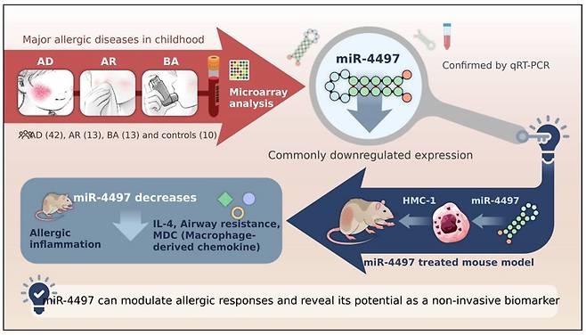 연구팀은 고대안암병원 소아환자 중 총 68명의 알레르기 환자군(아토피 피부염 42명, 알레르기 비염 13명, 천식 13명)과 10명의 건강 대조군을 대상으로 혈청 샘플을 수집해 마이크로RNA 발현을 분석했다. 그 결과, 'miR-4497’이라는 마이크로RNA가 세 질환 모두에서 공통적으로 눈에 띄게 감소되어 있음을 밝혀냈다.