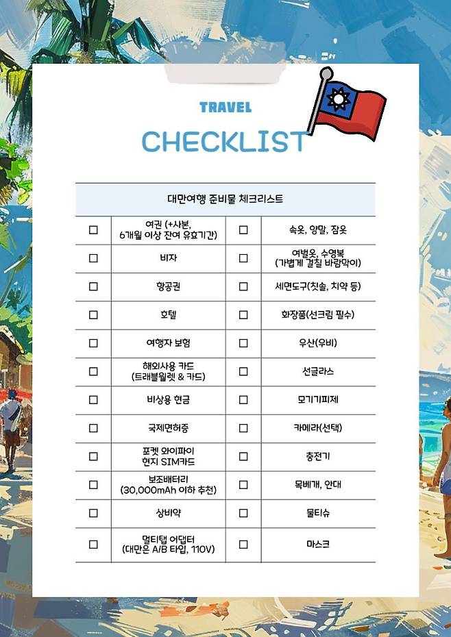 최근 인기가 급상승 중이라는 동남아 여행! 그중에서도 대만 또한 인기가 식을 줄 모르고 하늘 높이 치솟고 있습니다. 그래서 쾌적하게 떠날 수 있도록 대만 여행 준비물 체크리스트를 준비했습니다.