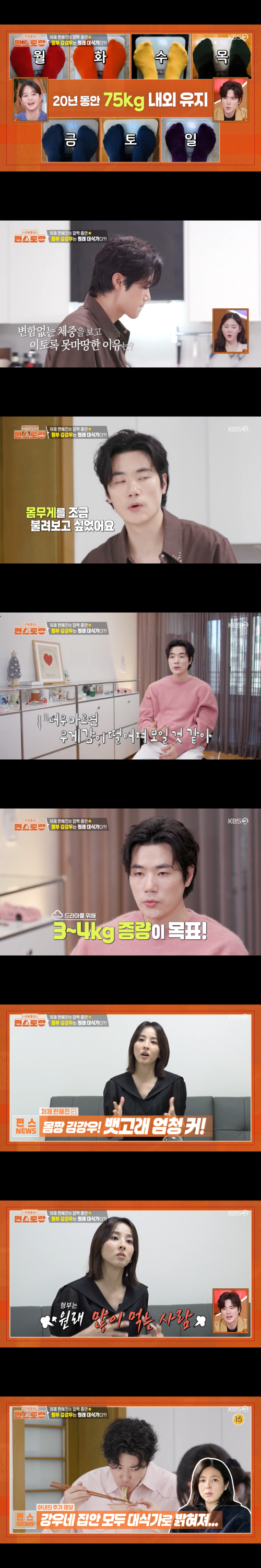 6일 방송된 KBS 2TV ‘신상출시 편스토랑’(이하 편스토랑)에서는 김강우가 꾸준한 체중 관리 비결과 함께 증량 계획을 밝히는 모습이 그려졌다.