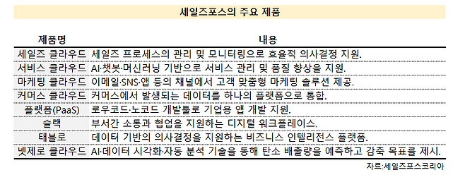 세일즈포스의 CRM 관련 주요 제품들은 클라우드 환경에서 서비스되는 SaaS입니다. 회사의 자체 데이터센터를 기반으로 서비스됩니다. 고객들은 별도의 프로그램 설치 없이 인터넷에 접속해 다양한 CRM 솔루션을 이용할 수 있는 셈입니다. 세일즈포스의 주요 제품은 △세일즈 클라우드 △서비스 클라우드 △마케팅 클라우드 △커머스 클라우드 △슬랙 △태블로 △넷제로 클라우드 등으로 구성됐습니다. 기업이 마케팅·영업·커머스 등의 활동을 펼치는데 있어 필수적인 솔루션들로 채워져있습니다.