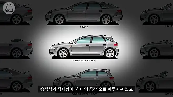 먼저 이 해치백이라는 장르에 대해 짚고 넘어갈 필요가 있는데요. 수많은 자동차 형태 중 하나인 해치백은 승객석과 적재함이 '하나의 공간'으로 이루어져 있고 적재함 쪽에는 해치도어, 즉 실내로 통하는 문을 단 차량을 뜻합니다. 전쟁 영화에 흔히 나오는 잠수함과 탱크의 그 해치죠. 반면, 엔진룸과 승객석, 적재함의 구분이 뚜렷한 자동차, 주로 세단 같은 형태를 다른 말로 '노치백'이라고 부르기도 하죠. 이건 해치백만의 특징이 아닙니다. 이렇게 생긴 차들이 참 많아서 갸우뚱하실 거예요. SUV나 CUV, 카니발 같은 MPV는 물론, 스팅어 같은 패스트백도 이런 형태죠.
