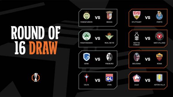 애스턴빌라(잉글랜드)-릴OSC(프랑스), AS로마-볼로냐(이상 이탈리아), 슈투트가르트(독일)-포르투(포르투갈), 올랭피크 리옹(프랑스)-셀타비고(스페인), 프라이부르크(독일)-헹크(벨기에), 레알 베티스(스페인)-파나티나이코스(그리스), 브라가(포르투갈)-페렌츠바로시(헝가리)도 16강에서 만난다.