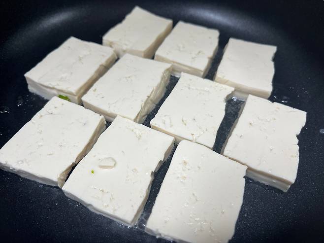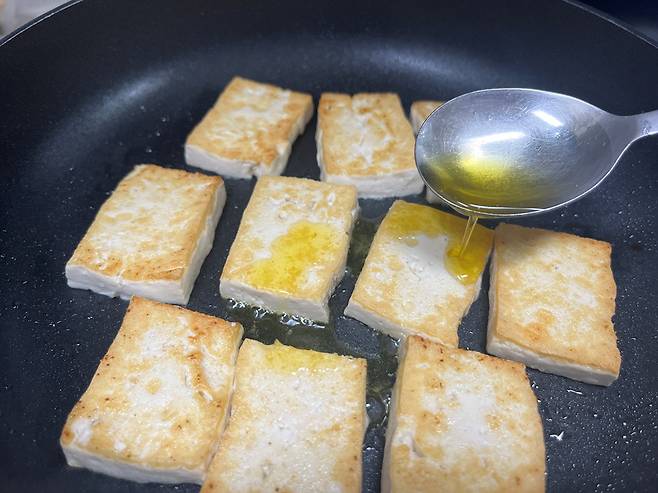 두부는 1cm~1.5cm 두께로 잘라서 굽습니다. 두부를 얇게 잘라야 더 쫄깃한 식감을 낼 수 있습니다. 팬에 식용유 두르고 중강불에서 두부를 구우세요. 그래야 수분이 날아갑니다.