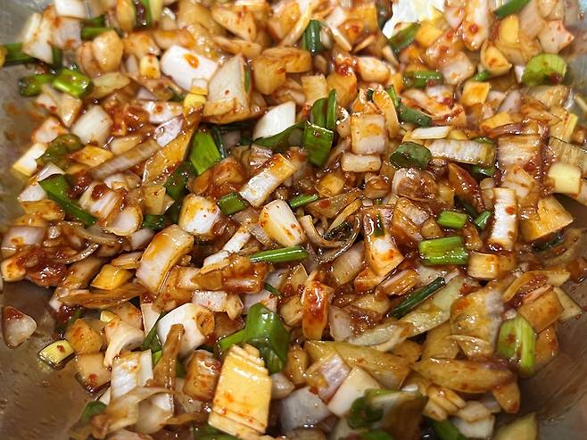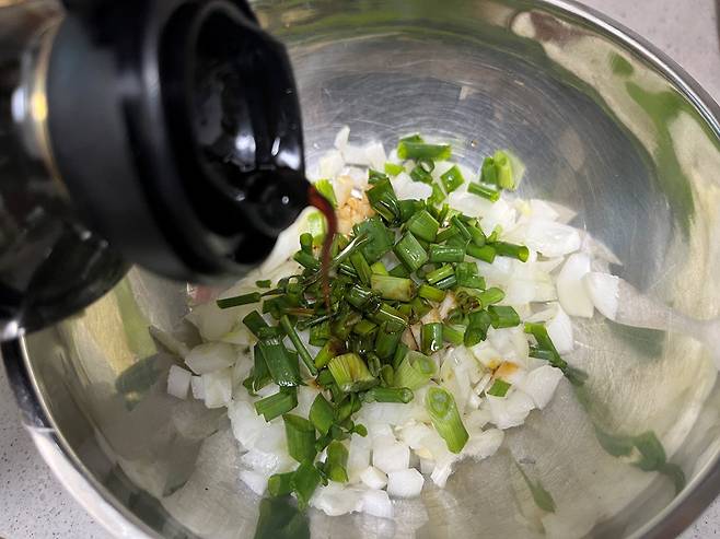 이렇게 만들어 두고 두부 위에 뿌려서 익히기만 하면 되는데요. 양념과 야채가 골고루 어우러질 수 있도록 섞습니다.