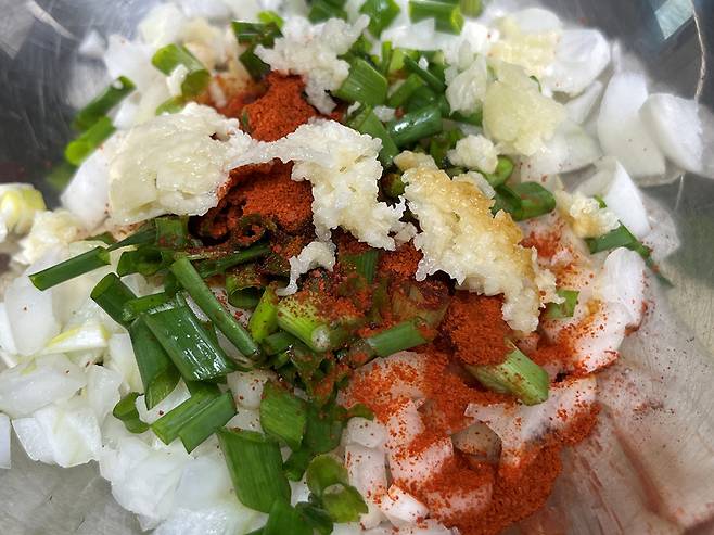 이렇게 만들어 두고 두부 위에 뿌려서 익히기만 하면 되는데요. 양념과 야채가 골고루 어우러질 수 있도록 섞습니다.