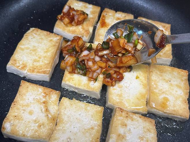두부가 어느 정도 구워지면 위에 만들어둔 양념장을 올립니다. 두부 위에 골고루 올려 주세요.