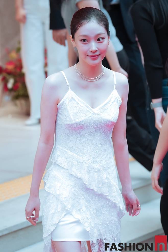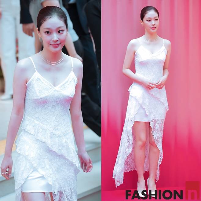 이날 최희진은 화이트 미니 스커트 위에 다시 화이트 언발란스 시스루 슬립 원피스를 착용한 드레스룩으로 몽환적인 분위기를 연출했다.