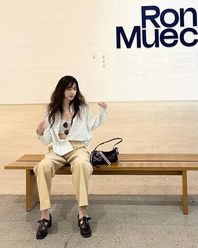 화이트 스트라이프 크롭 블레이저와 베이지 와이드 팬츠를 매치해 모던하고 세련된 오피스 룩을 연출하고 있다. 검은색 로퍼와 미니백으로 포인트를 주어 전체적인 룩의 완성도를 높였다. 미술관에서의 컷으로 지적이고 품격 있는 이미지를 강조하고 있다.