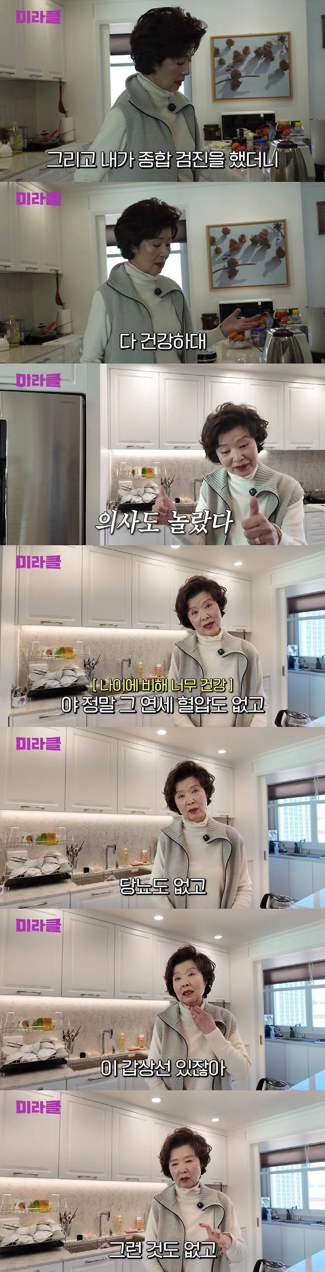 또한 제작진이 관절약이나 혈압약 등 노년층이 주로 복용하는 약을 복용하는지 묻자, 윤미라는 "전혀 안 먹는다"며 "병원에서 의사 선생님이 그 나이에 혈압도, 당뇨 문제도 없고, 여성들에게 흔히 생기는 갑상선 문제도 없다고 하셨다. 완벽하다고 하더라"고 전했다. 그러면서 "항상 건강에 신경을 쓰지, 막 살지는 않는다"며 꾸준한 자기관리의 중요성을 강조했다.