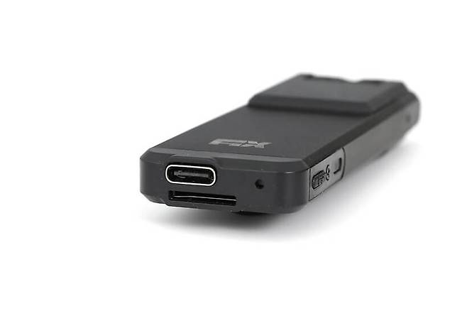 본체 아래쪽에는 충전 단자와 메모리카드 슬롯이 있다. 충전 단자 규격은 USB C타입으로, 스마트폰 충전 케이블을 공유할 수 있다는 장점이 있다. 충전 단자 옆에 보이는 작은 구멍은 리셋 홀로, 기기가 응답하지 않을 때 구멍을 핀 등으로 누르면 강제 종료되어서 다시 켜서 사용할 수 있다.