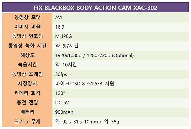 픽스 블랙박스 바디 액션캠 XAC-302는 일반 액션캠과는 사뭇 다른 외형을 갖추고 있다. 직사각형에 납작한 모양을 하고 있으며, 색상은 블랙 단일 컬러로 이루어져 있다.