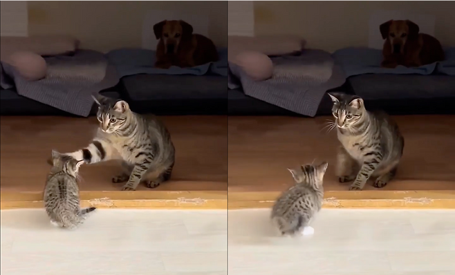 아니나 다를까, 곧바로 앞발을 들어 아기 고양이 머리를 콩 때리며 체벌을 합니다. 어미 고양이의 단호한 모습에 아기 고양이는 몸을 움츠리는데요. 그때 갑자기 어디선가 챠챠챠챠- 하는 소리가 들려옵니다.