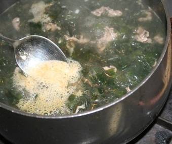 재료: 마른 미역 10g, 참기름 1큰술, 국간장 1큰술, 다진 마늘 약간, 정수물 600ml, 두부 또는 조갯살