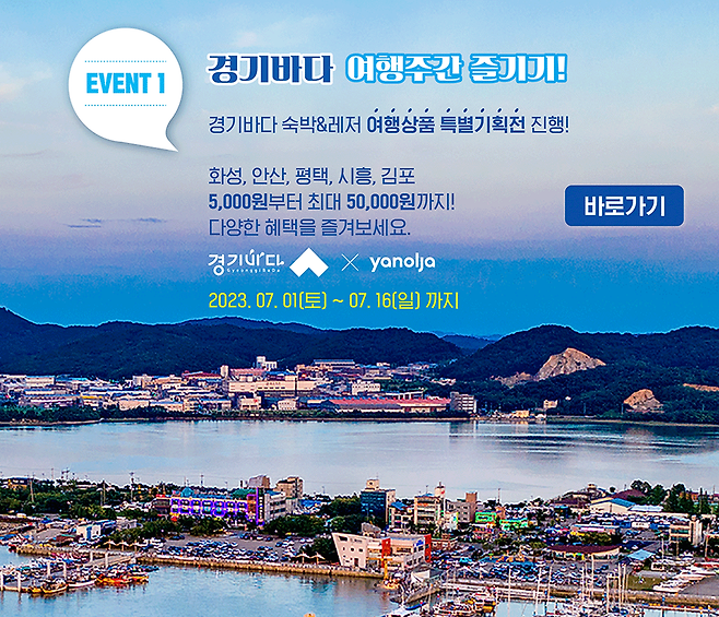 먼저, 7월 1일부터 16일까지 경기바다와 여행 플랫폼 ‘야놀자’와 연계해 화성, 안산, 평택, 시흥, 김포 5개 시 숙박 및 레저 체험상품 등을 최대 5만 원까지 할인 제공하는 숙박&레저 특별 기획전을 진행합니다.