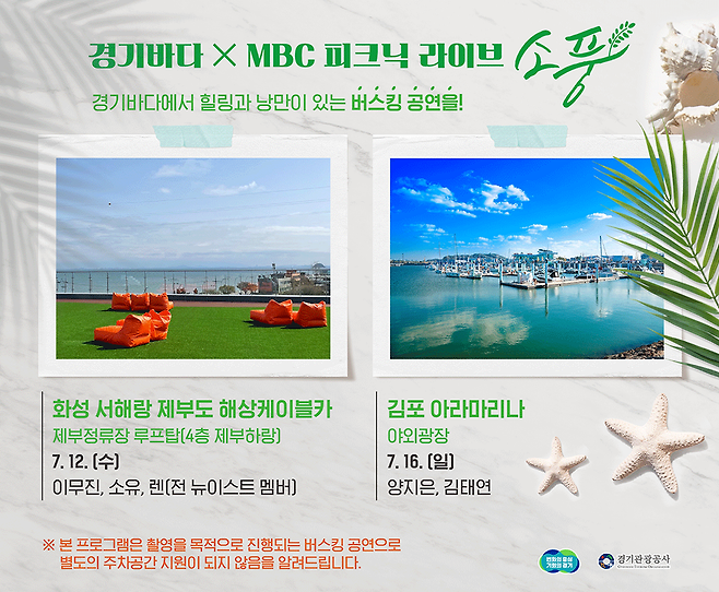 7월 12일 수요일에는 화성 서해랑 제부도 해상케이블카(이무진, 소유, 렌)에서 7월 16일 일요일에는 김포 아라마니라 야외광장(양지은, 김태연)에서 경기바다 버스킹 공연을 즐길 수 있습니다.