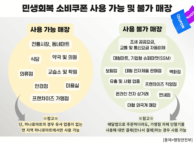 반면 이마트·롯데마트·홈플러스 등 대형마트부터 쿠팡·마켓컬리 등 온라인 쇼핑몰, 코스트코·트레이더스 같은 창고형 매장, 백화점, 면세점, 배달앱 등은 모두 사용이 제한된다. 유통 대기업이 운영하는 채널은 지원 대상에서 원칙적으로 제외되기 때문이다.