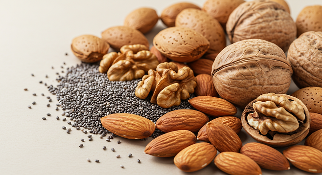 아몬드, 호두, 치아씨드 등은 건강한 지방과 단백질, 식이섬유가 풍부합니다. 특히 호두는 뇌 건강에 좋은 오메가-3 지방산을 함유하고 있으며, 치아씨드는 체중 조절에 도움이 되는 식이섬유가 풍부합니다. 하루 한 줌(약 30g) 정도의 견과류는 간식으로 완벽합니다.