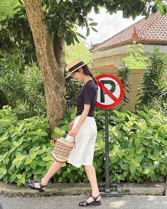 블랙 가디건과 화이트 버뮤다 팬츠의 조합은 깔끔하면서도 경쾌한 인상을 주고, 라탄 버킷백과 스트로 햇이 더해지면서 여유로운 휴양지 무드가 완성돼요.