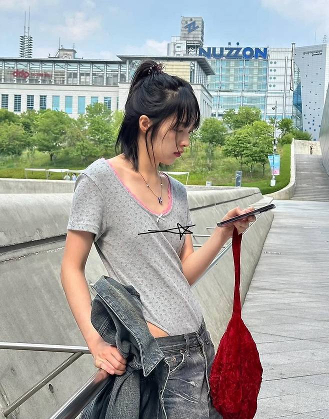 빈티지 워싱이 돋보이는 진 팬츠와 데님 재킷을 매치해 스트리트 감성을 살렸으며, 레드 컬러의 레이스 가방으로 포인트를 주어 감각적인 디테일을 더했습니다.