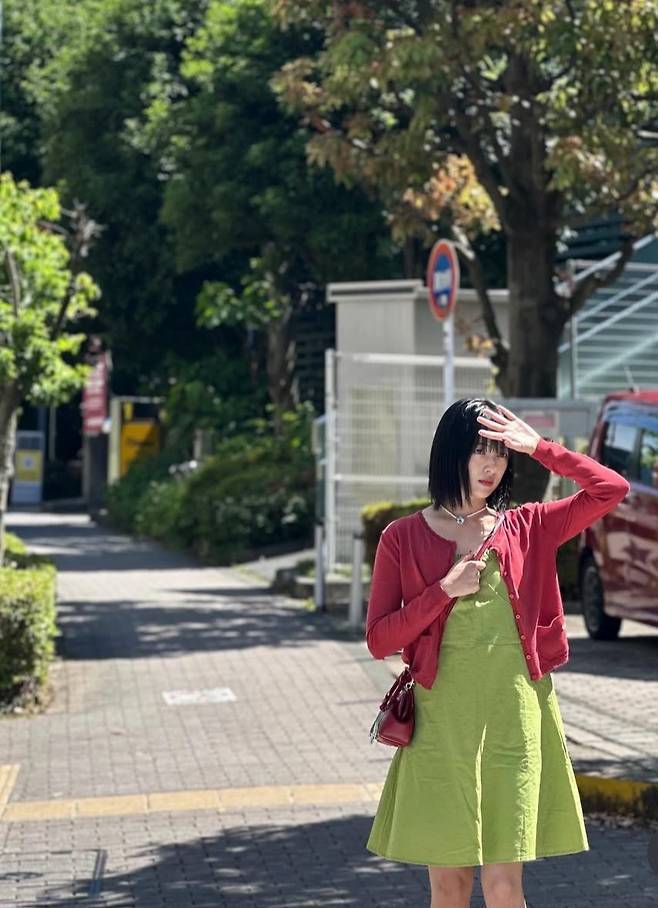 라임 그린 계열의 민소매 원피스를 선택해 청량하고 산뜻한 무드를 자아냈으며, 얇은 소재로 여름철 시원한 분위기를 연출했습니다.