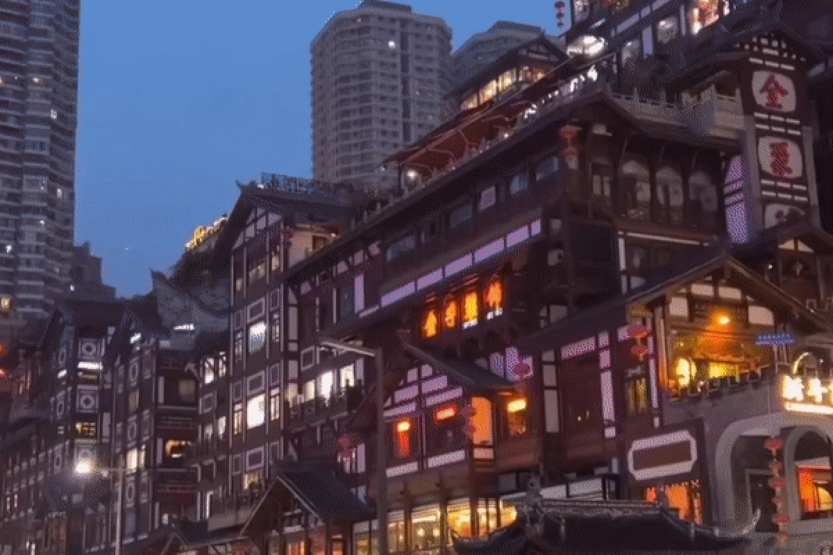 홍야동의 진정한 매력은 밤에 더욱 빛납니다. 따스한 조명이 건물을 감싸고, 그 불빛이 가릉강과 양쯔강에 반사되어 환상적인 풍경을 자아냅니다.