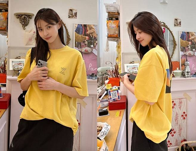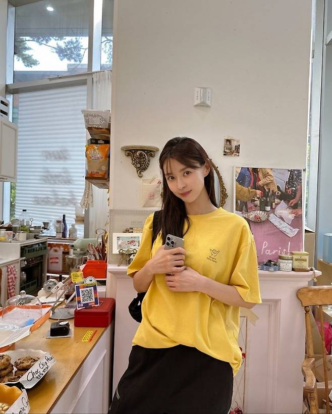 권나라는 노란색 반팔티를 착용해 귀엽고 상큼한 이미지를 뽐냈습니다.