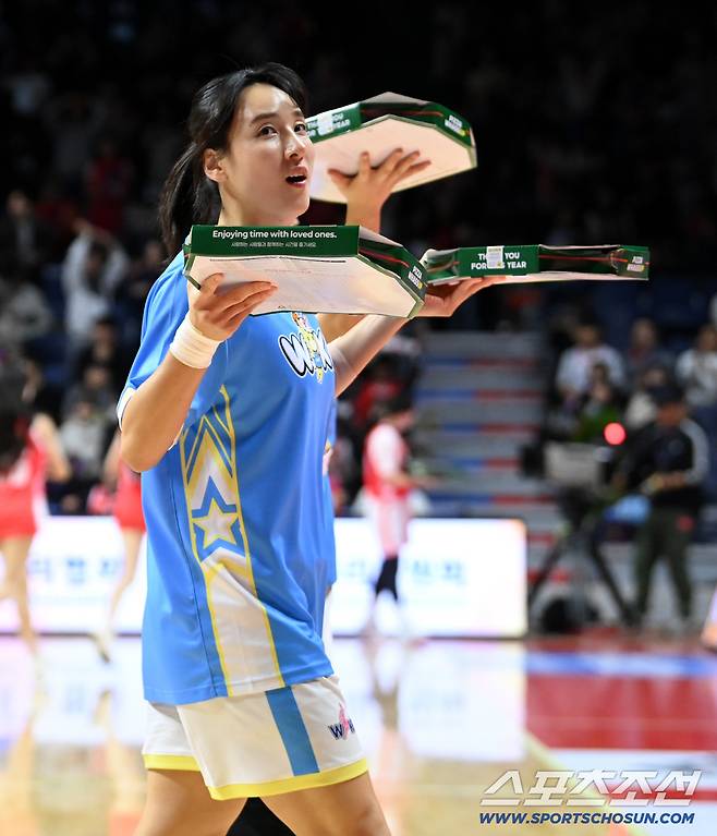 4일 부산사직체육관에서 열린 여자프로농구 올스타 페스티벌. 김단비가 팬에게 선물할 피자를 들어보이고 있다. 부산=허상욱 기자wook@sportschosun.com/2026.01.04/