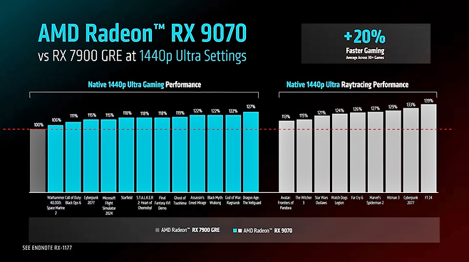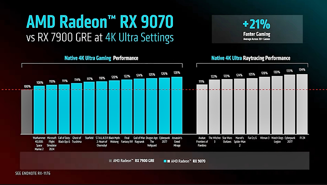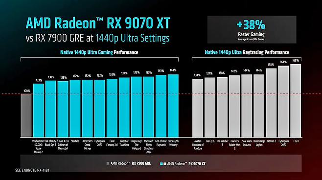RX 9070 XT는 이전 세대인 라데온 RX 7900 GRE와 비교하면 QHD 해상도에서는 평균 +38%, 4K 해상도에서는 평균 +42% 우수한 성능을 발휘하여 이전 세대 자사 플래그십인 RX 7900 XTX와 유사한 수준이며, 레이트레이싱을 켠 상태에서의 퍼포먼스는 해상도와 게임 타이틀에 따라 최대 +68% 개선됐다. *AMD 발표 기준, 30개 이상의 게임에서 QHD/4K해상도 울트라 세팅으로 테스트한 결과이며, 소프트웨어 업스케일링을 적용하지 않은 순수한 하드웨어 성능을 의미함