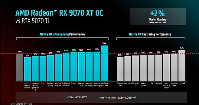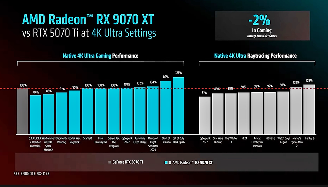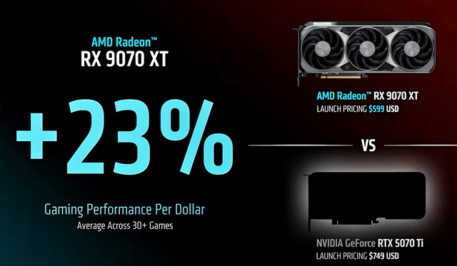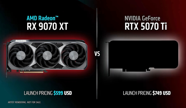 이번 발표에서 AMD는 자사의 라데온 RX 9070 XT와 엔비디아 지포스 RTX 5070 Ti를 경쟁구도로 꼽았다. AMD는 발표 자료에서 RX 9070 XT($549)는 지포스 RTX 5070 Ti($749)와의 비교에서 평균 -2%라고 주장했다. 게임에 따라 엎치락 뒷치락 하는 등 사실상 동급 그래픽카드임을 공언한 것.