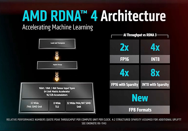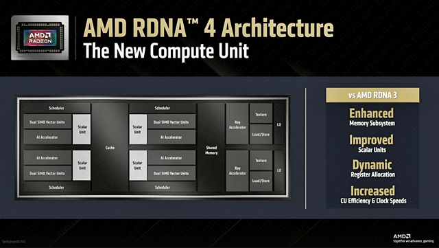 라데온 RX 90시리즈에 쓰인 RDNA4 아키텍처는 새롭게 구성한 CU(컴퓨트 유닛, Compute Unit)를 사용한다. 스칼라 유닛을 늘렸고 메모리 서브시스템도 개선해 이전 세대인 RDNA3보다 더 우수한 효율, 더 높은 동작주파수(클럭)를 확보했다.