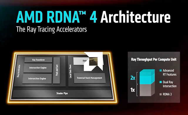 또 다른 특징으로는 3세대 레이트레이싱 가속기를 탑재했다는 점이다. 라데온 3세대 레이트레이싱 가속기는 메모리 소모량을 줄여 그래픽카드에 가해지는 부하를 줄였고 효율도 개선해 이전 세대보다 최종적으로 두 배 강화된 레이트레이싱 성능을 보여준다. 경쟁사 동급 모델 대비 낮았던 레이트레이싱 성능을 이번 세대에서 대부분 따라잡았다.